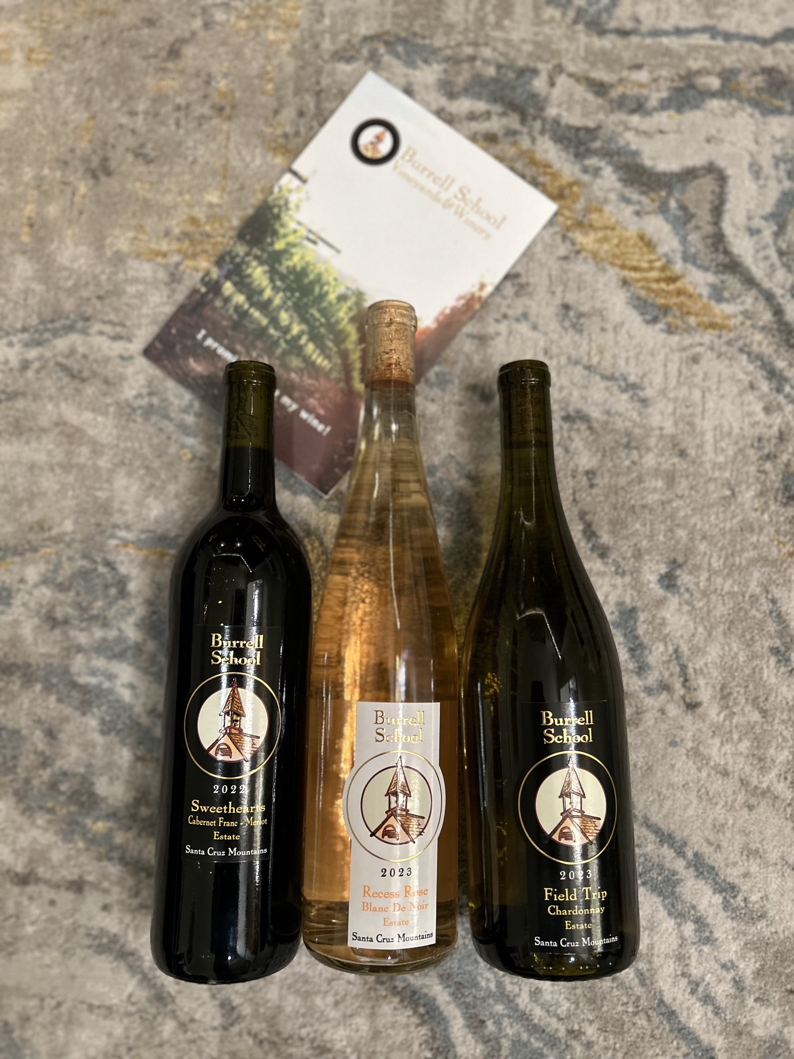 This basket features 3 bottles of wine (Chardonnay, Rose, Red blend) from Burrell School Vineyards in the beautiful Santa Cruz Mountains of California. At a 1,600 foot elevation, the vineyard faces to the southwest. Soils are a complex mixture of loam and shale due to the close proximity to the San Andreas Fault, and the nearby Monterey Bay brings warm days and cool nights. The cool-climate grapes coming from this location have resulted in these award-winning wines.