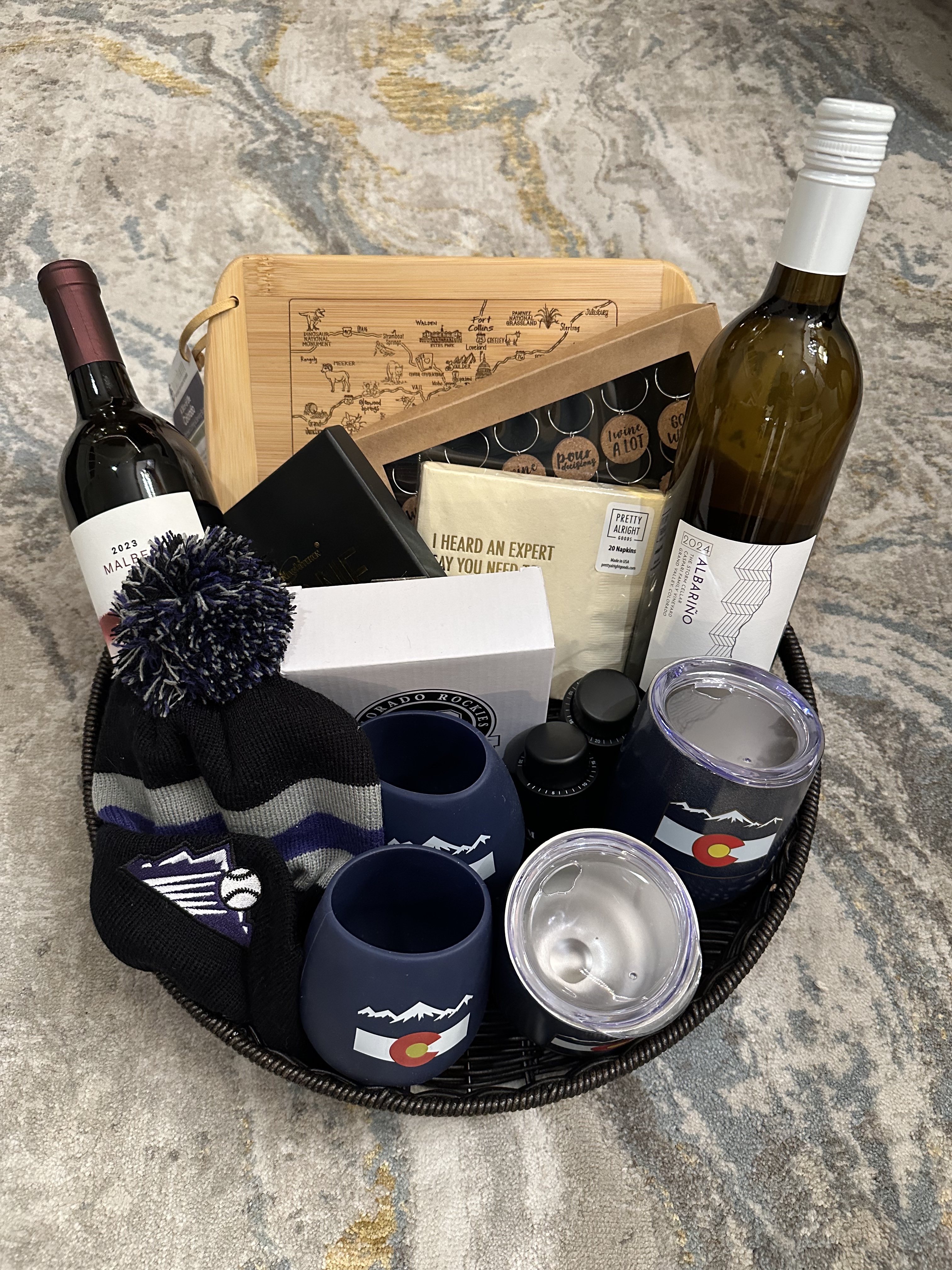 Celebrate Colorado’s wine country and state pride with this beautifully curated collection of local wines, entertaining essentials, and Colorado-themed treasures. Basket includes: Bookcliff Vineyards 2023 Malbec – Rich, bold red from Palisade’s premier winery; The Storm Cellar 2024 Albariño – Crisp, refreshing white with elegant citrus notes. Entertaining Essentials; Slice of Life Bamboo Laser-Etched Colorado Cutting Board – Stunning serving piece for cheese, charcuterie, or appetizers; New Kitchen Wine Covers – Keep your wine fresh and stylish; Cocktail Napkins – Perfect for hosting; Pack of 12 Wine Markers – Never lose track of your glass at parties; 2 Wine Stoppers – Preserve your favorite bottles; Colorado Rockies Coasters – Protect surfaces while showing team spirit; Colorado Rockies Beanie – Stay warm and rep the home team; 2 Colorado Silicone Wine Cups – Flexible, portable, and perfect for outdoor adventures; 2 Insulated Colorado Flag Wine Tumblers with Lids – Keep wine at the perfect temperature whether tailgating, camping, or lounging.