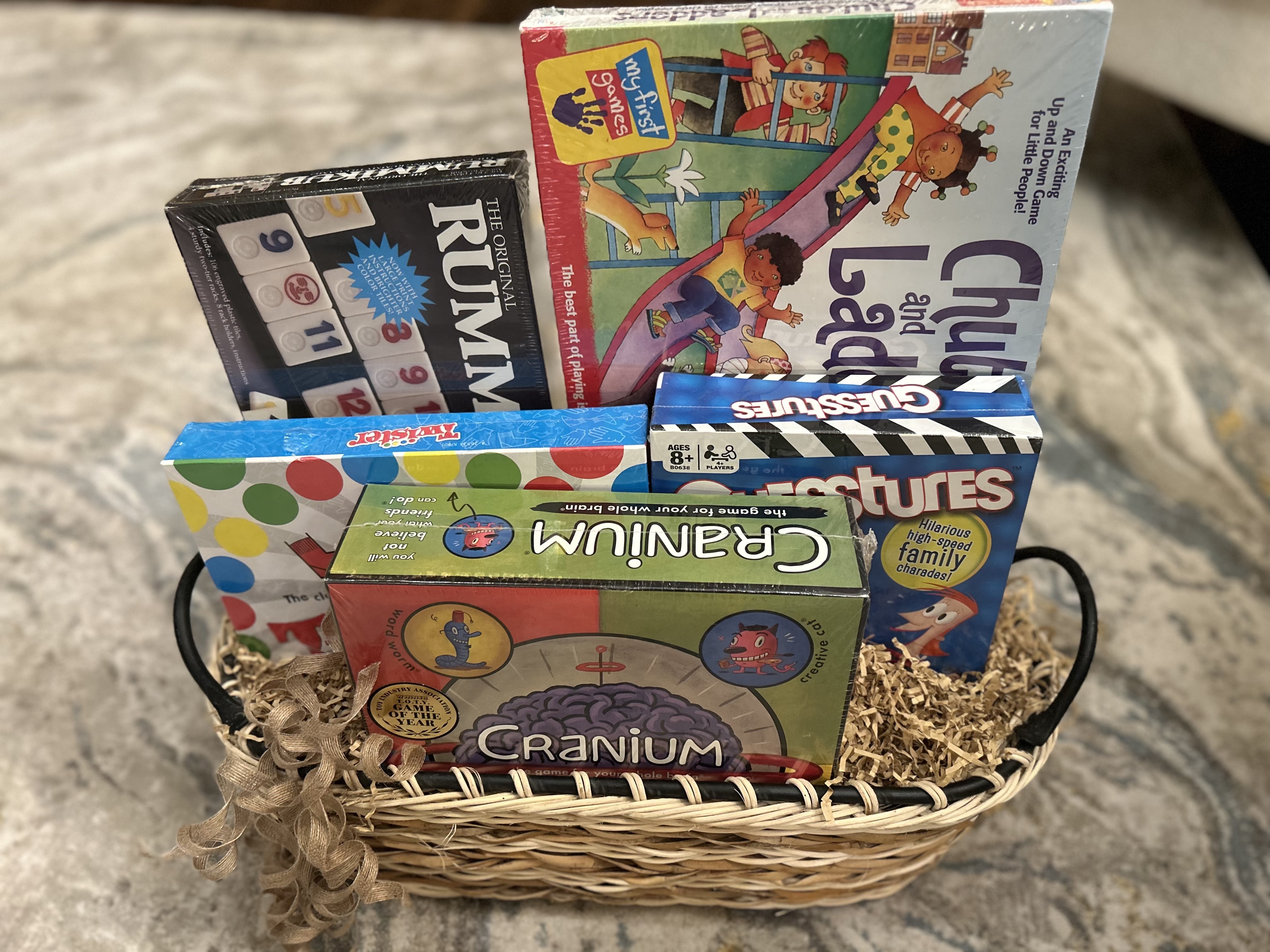 Get ready to bring the fun home with this all-in-one Game Night Basket! Packed with classic favorites and crowd-pleasing games, this set is your ticket to unforgettable evenings of laughter and fun. Includes: Twister, Guesstures, Cranium, Rummikub, Chutes and Ladders.