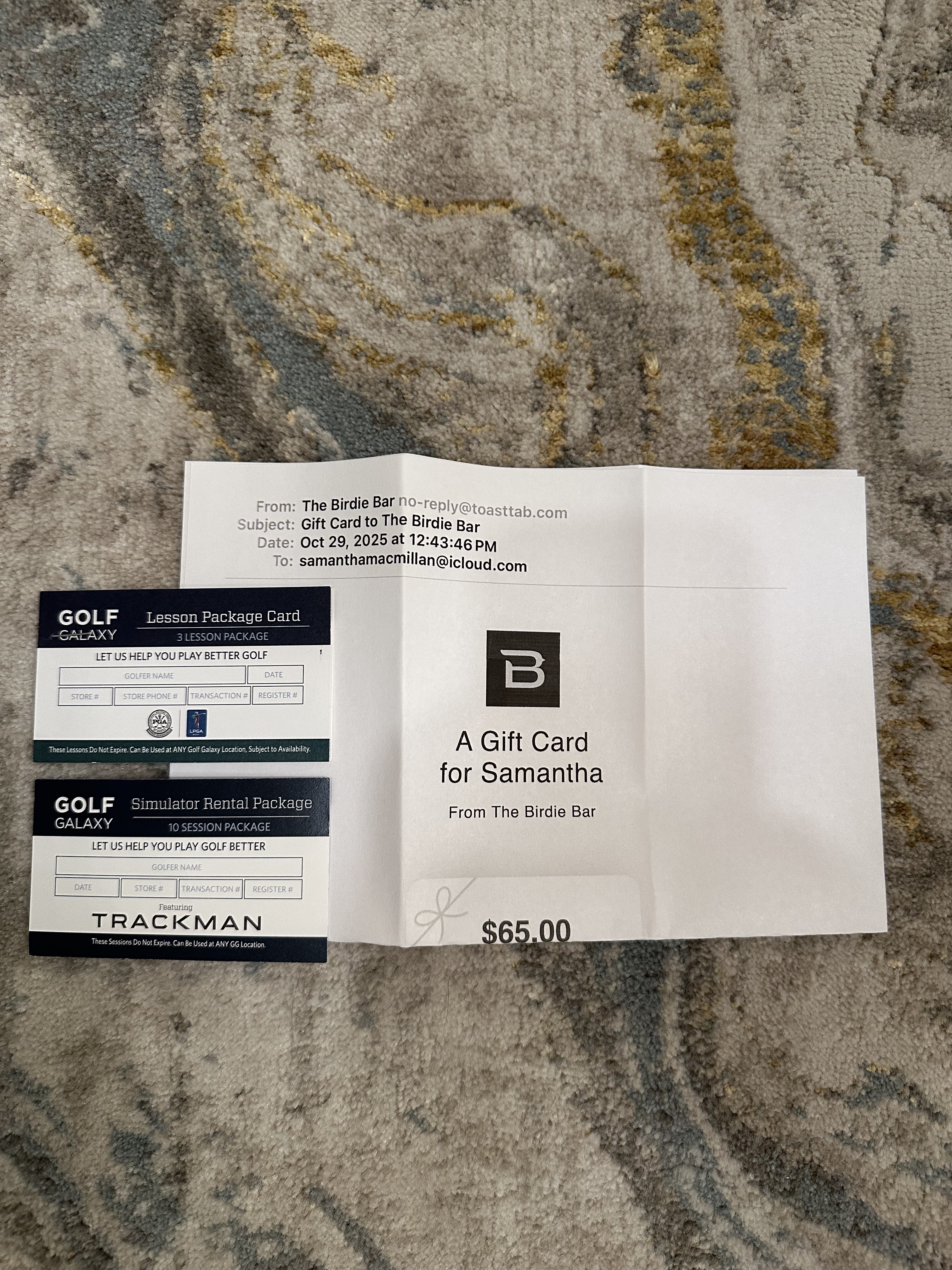 Up your golf game with a 3-lesson package at Golf Galaxy, a 10-session golf simulator rental package at Golf Galaxy, and a $65 gift card at The Birdie Bar.