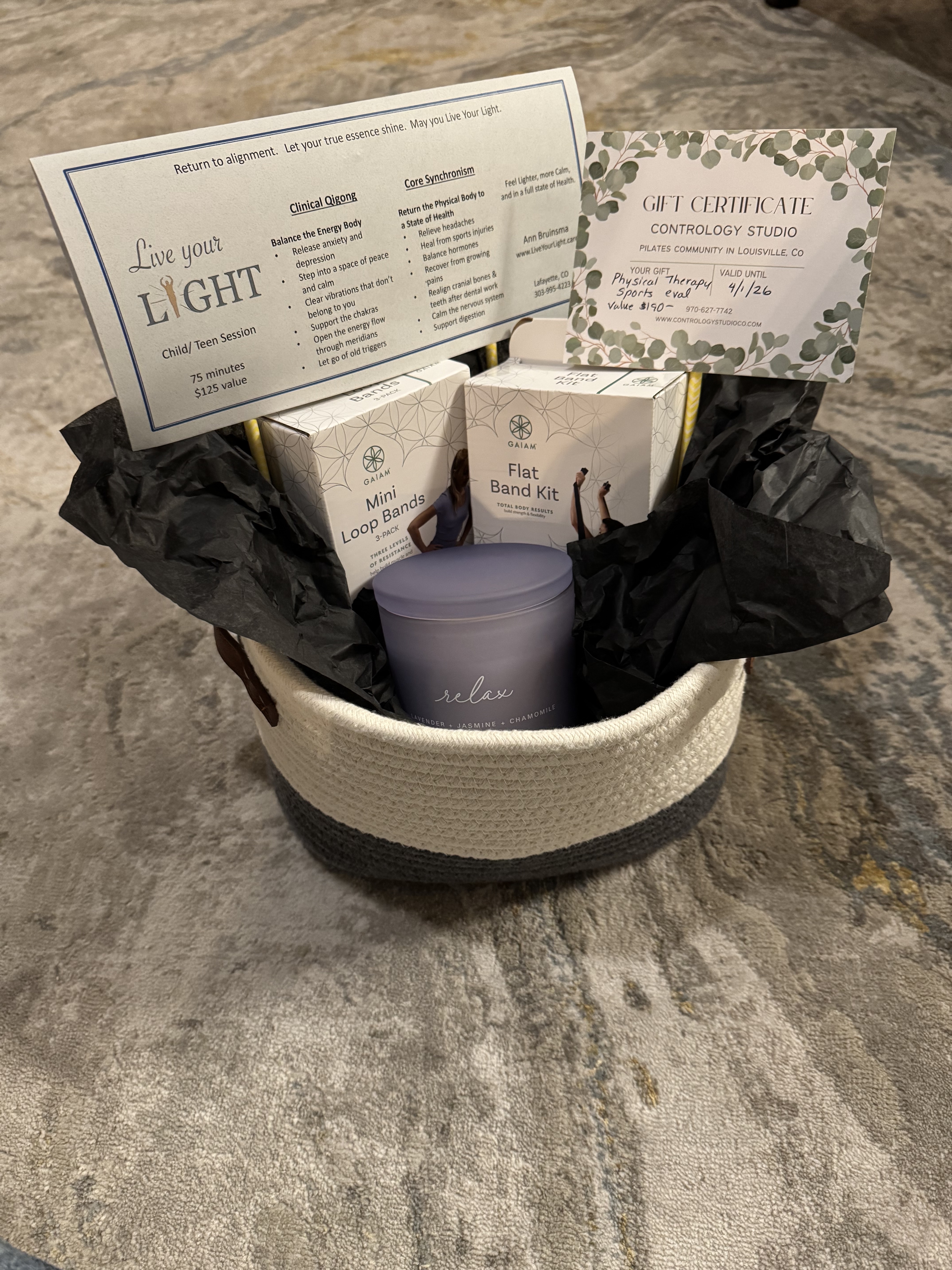 Perfect for Pilates Pros or Curious First Timers, this basket includes 4 class pilates package, trendy mesh hat, contrology swag kit, grippy pilates socks, and a high-quality pilates mat.