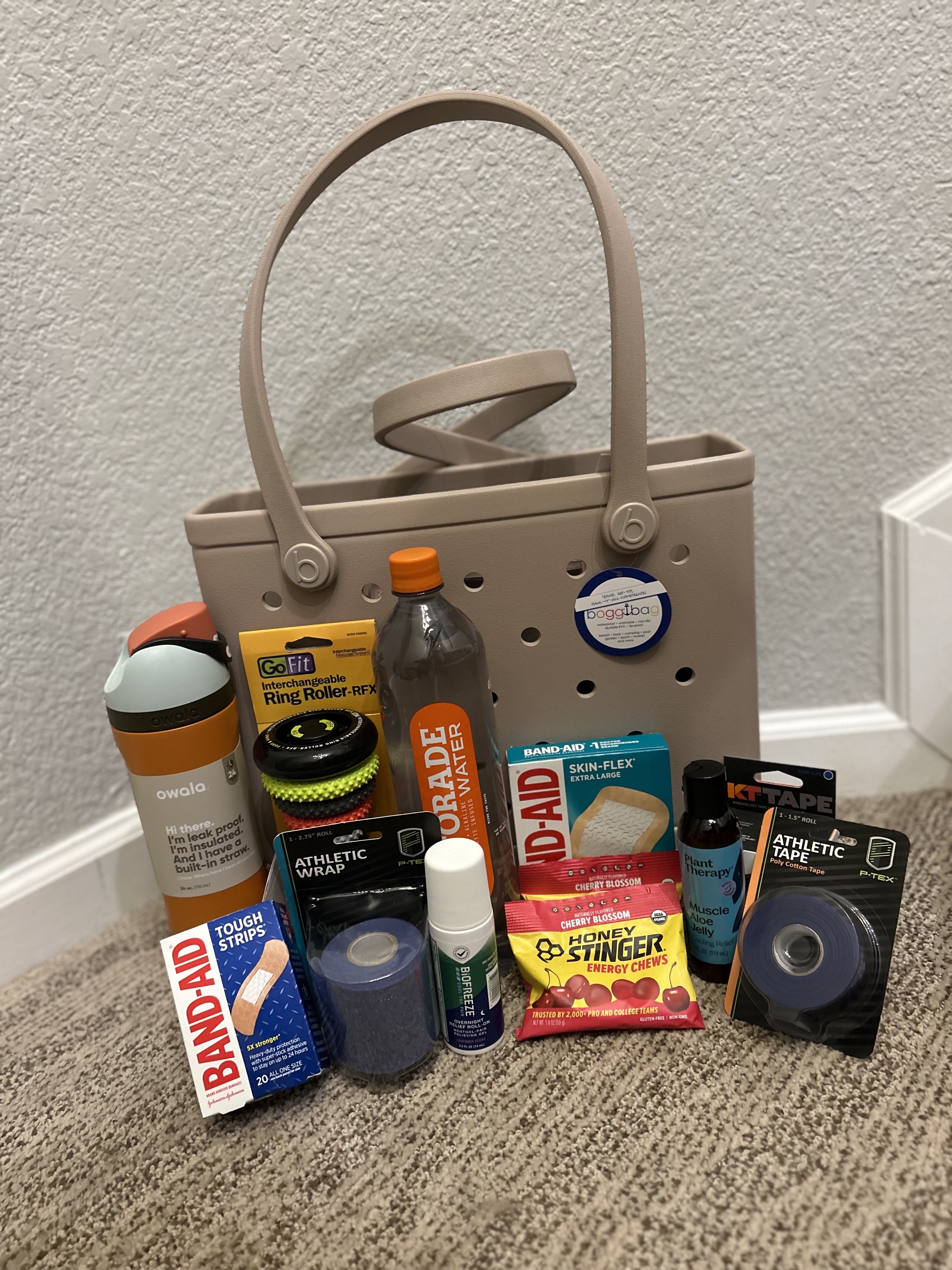 All of your recovery needs in one awesome tote. Includes bogg bag, bandaids, Owala water bottle, Ring Rollermassage stick, Biofreeze and muscle jelly, KT tape, athletic tape, energy chews, and electrolyte water.